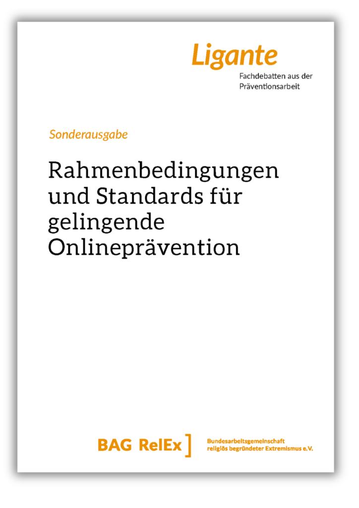 Ende 2023 wurden die Rahmenbedingungen und Standards gelingender Onlineprävention (PDF) als Erweiterung der 2019 veröffentlichten Standards publiziert. In dieser zweiten Ausgabe der Ligante wird nach einer Ausführung grundlegender Begriffe und Konzepte des Arbeitsbereiches (Kapitel 1.1) unter anderem ein Überblick über Radikalisierungsprozesse sowie extremistische Akteure in der digitalen Welt gegeben (Kapitel 1.2 und 1.3).